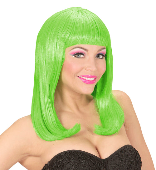 Steel de show met de Pruik neon groen showgirl! Perfect voor carnaval of een feestje. Voel je als een ster en trek alle aandacht naar je toe! Kenmerken Neon groene kleur Showgirl stijl Comfortabel en opvallend Word de ster van...