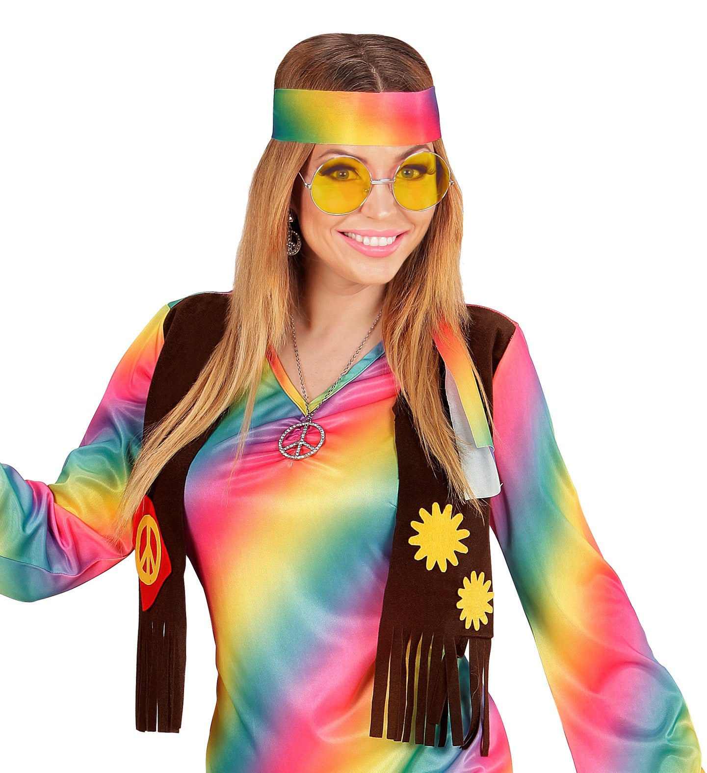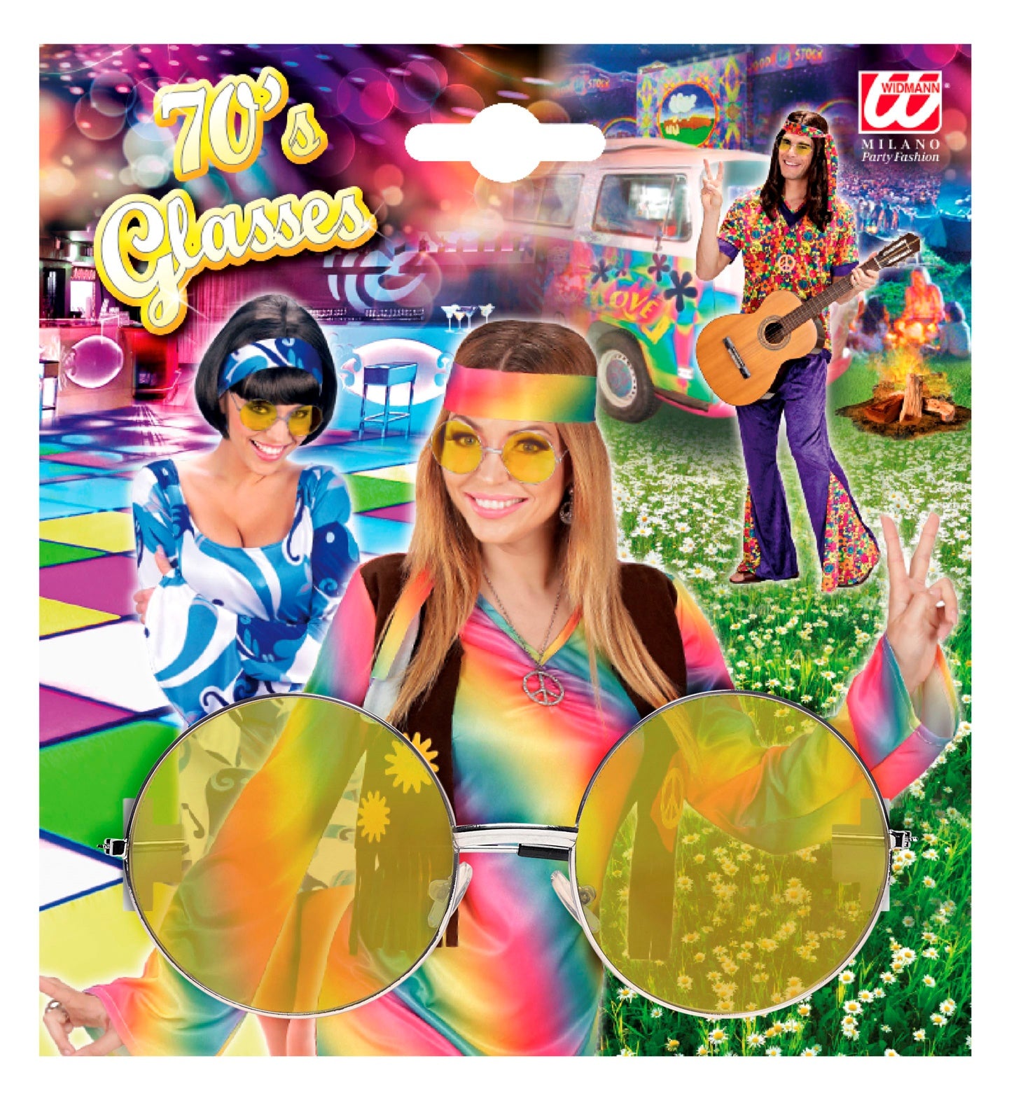 Stap terug in de tijd met deze vrolijke gele hippiebril! Perfect voor elk feestje, festival of gewoon een zonnige dag.... En savoir plus