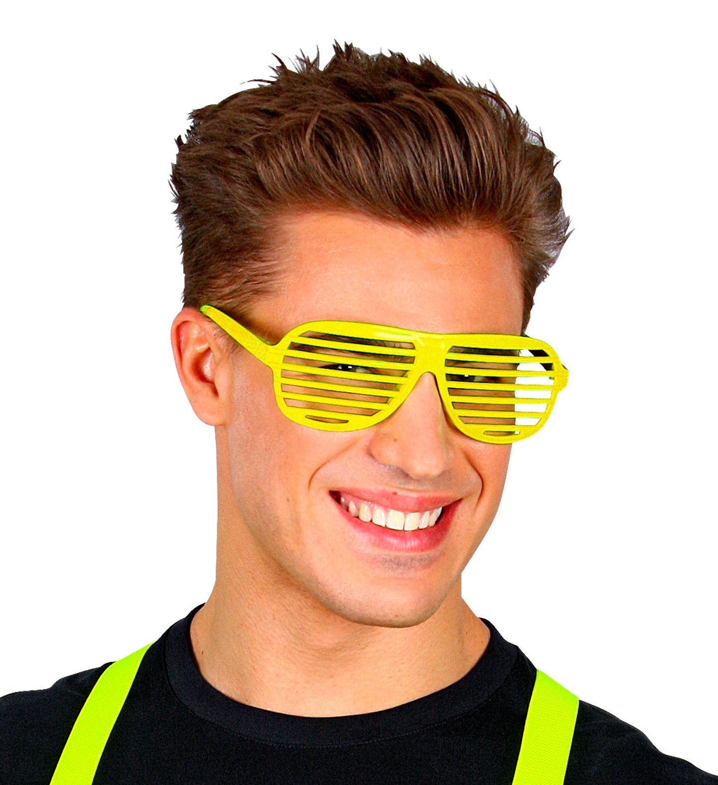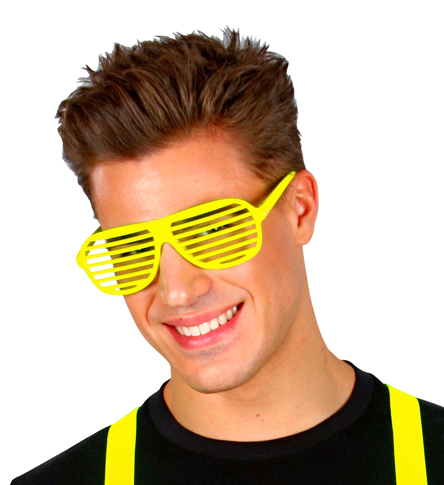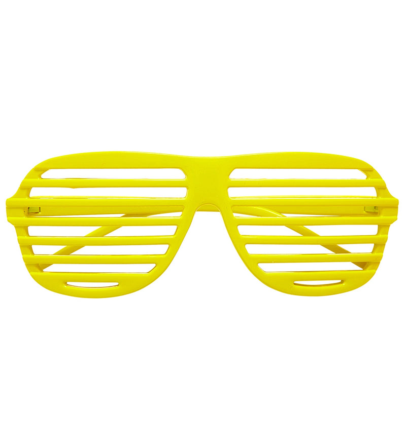 Stap in de spotlights met deze gele bril met luikjes! Perfect voor elk feestje en gegarandeerd een lach op je... En savoir plus