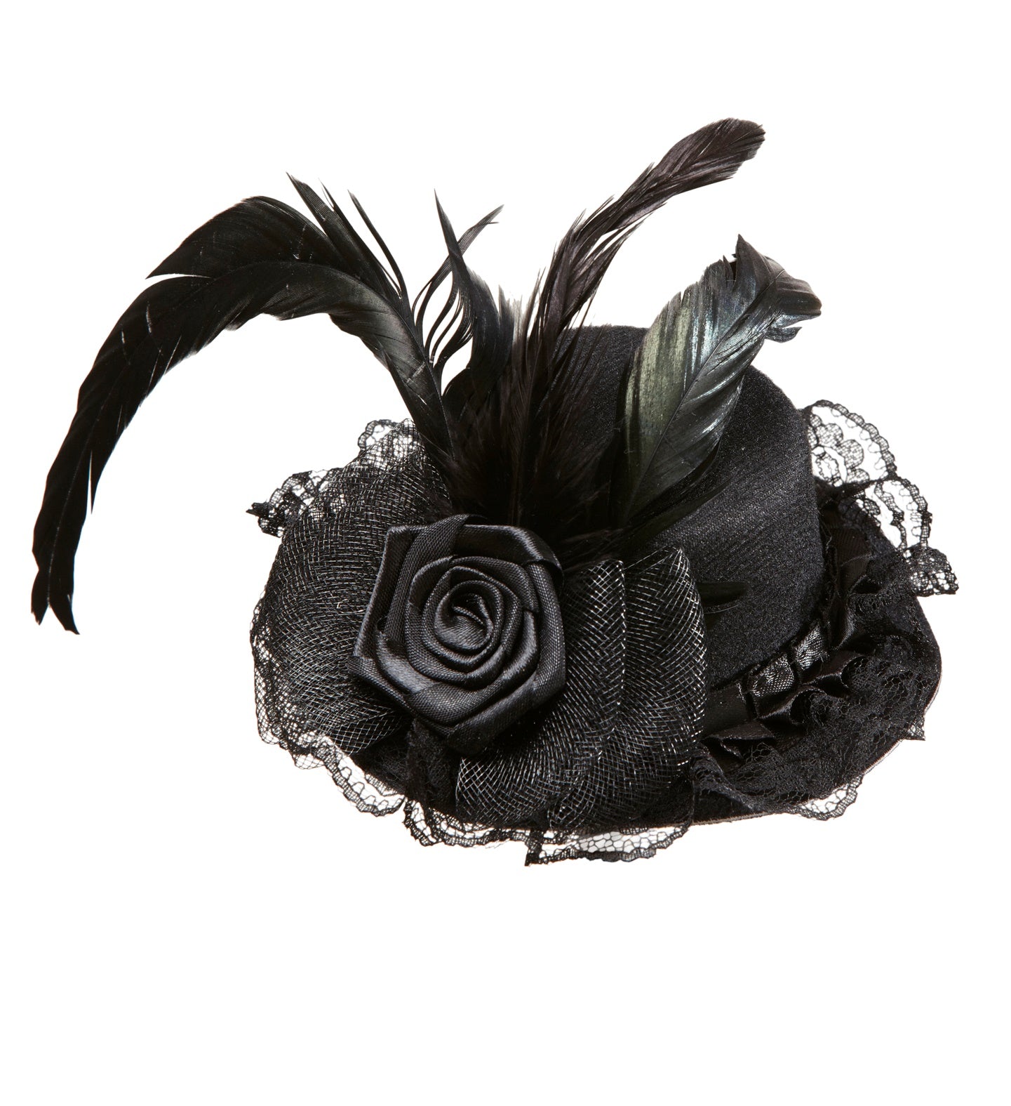 Mini zwarte hoed met roos en veer op haarband