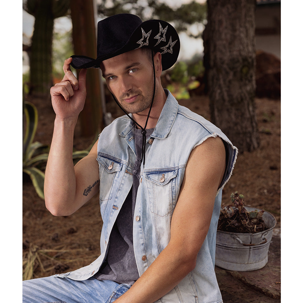 Ben je klaar om de ster van de show te zijn tijdens het volgende carnavalsfeest? Met de Cowboyhoed Starlight Glitters in zwart ben je verzekerd van een sprankelende entree! Deze hoed is niet alleen een stijlvolle toevoeging aan je outfit, maar ook een echte blikvanger die je feestlook compleet maakt. Of je nu een stoere cowboy of een glamoureuze cowgirl wilt zijn, deze hoed past perfect bij elke feestelijke gelegenheid.