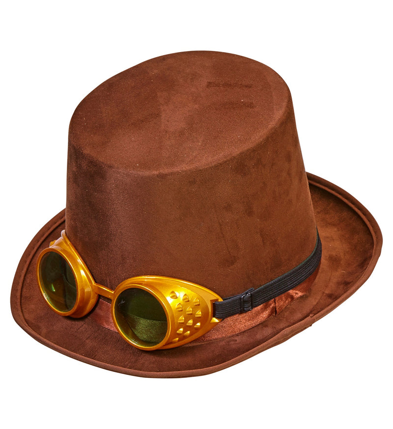Hoge hoed steampunk bruin met stofbril