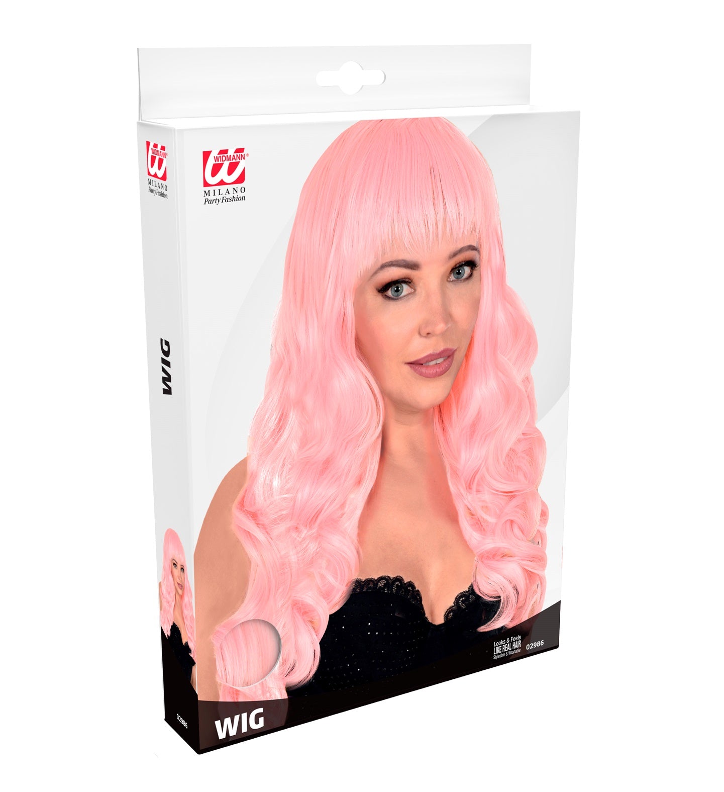 Licht roze pruik met pony en lang krullend haar