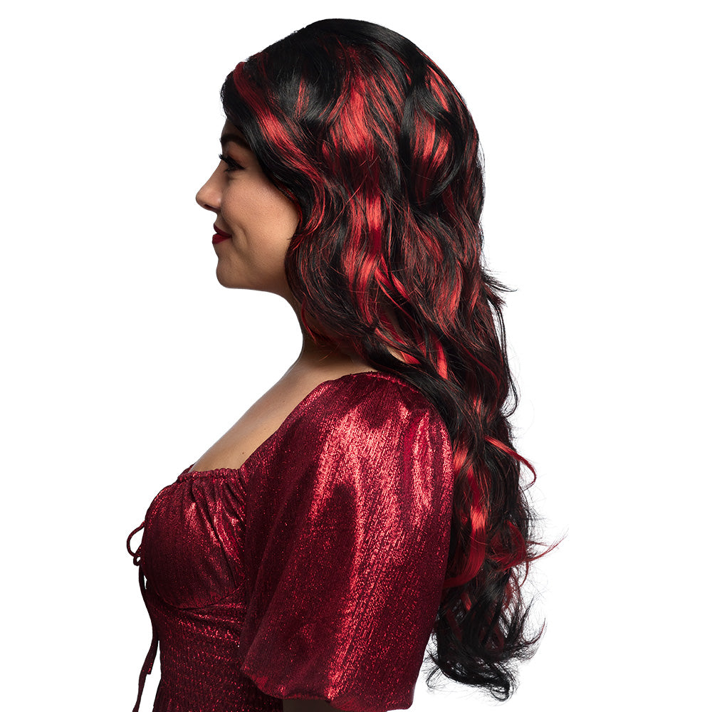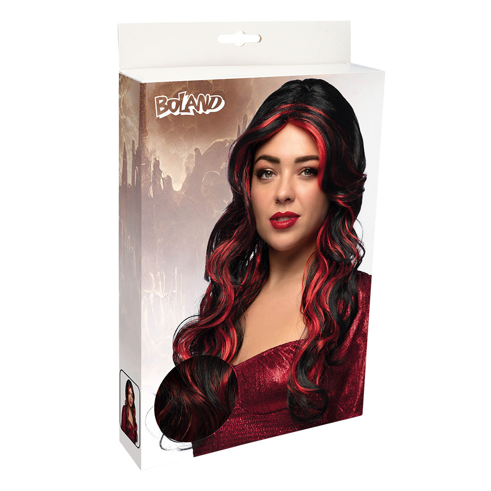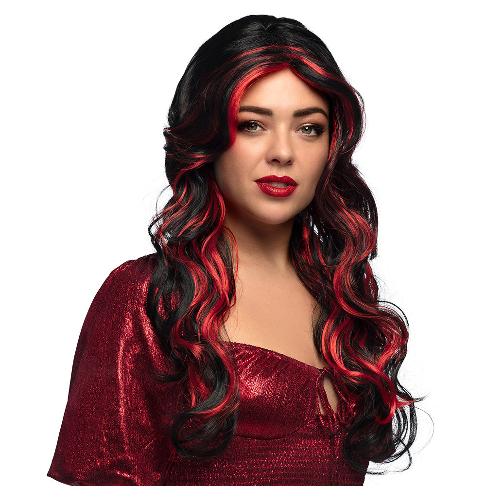 Duivelin pruik lang zwart rood