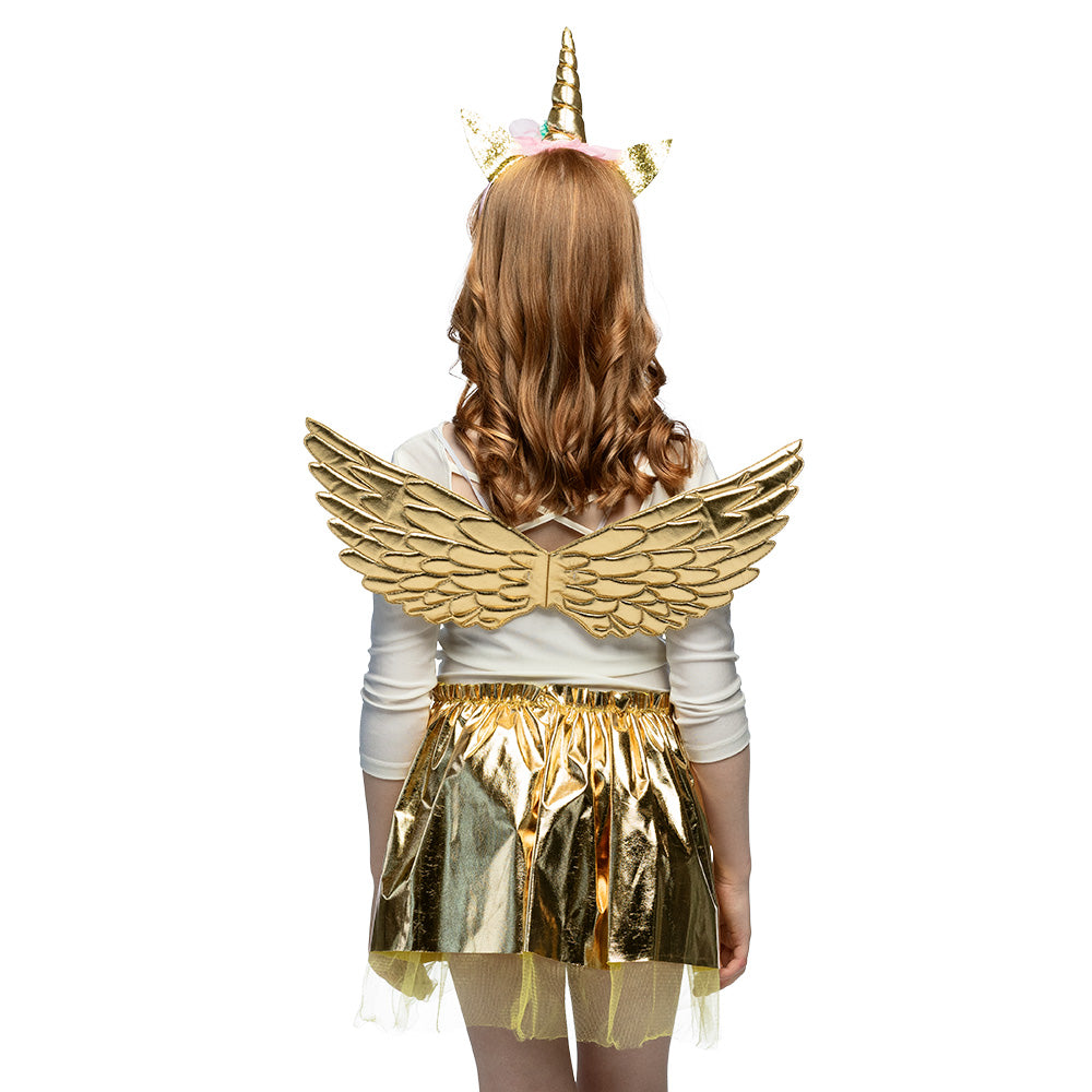 Met de Unicorn eenhoorn verkleed set goud transformeer je in een handomdraai in een magische eenhoorn. De gouden diadeem met hoorn zorgt ervoor dat je meteen opvalt, terwijl de vleugels je het gevoel geven dat je zo de lucht in kunt zweven. De speelse tutu maakt het plaatje compleet en zorgt ervoor dat je bij elke stap een beetje magie verspreidt. Ideaal voor meisjes die houden van fantasie en avontuur!